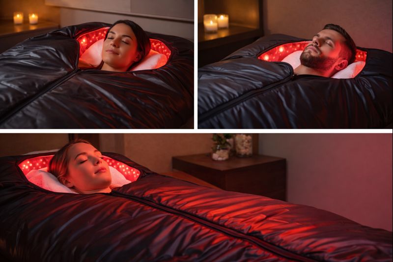 Sessions take place inside a full-body infrared light pod designed to deliver red and near-infrared wavelengths. You remain fully clothed and relaxed during the session while the system runs on a timed cycle.